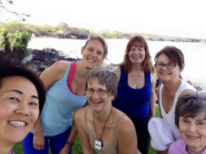 Me after a yoga class on the beach in Hawaii at a retreat – including my friend Montie (brunette on the right with glasses). In fact, Montie led the class – she’s a yoga instructor.